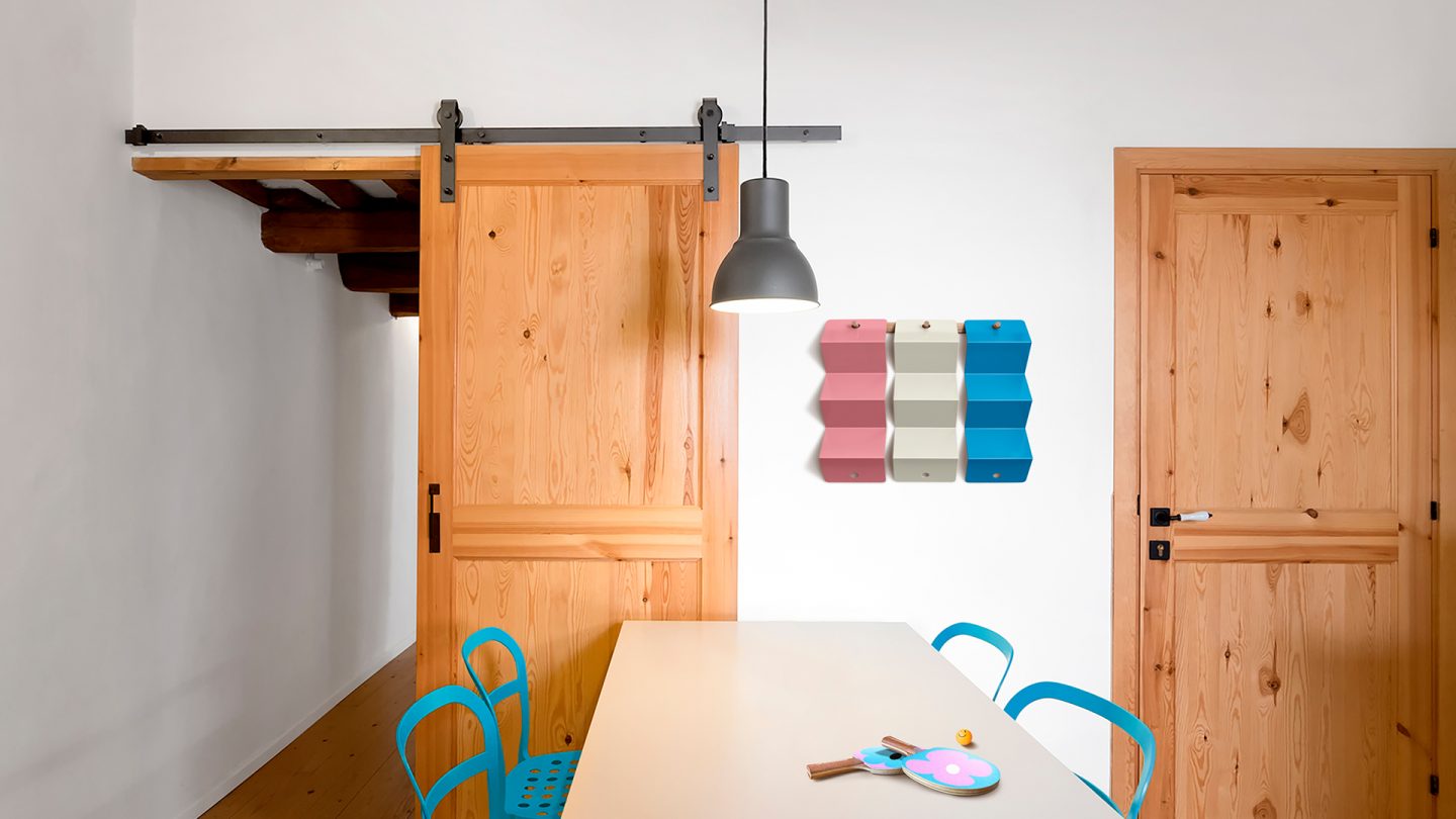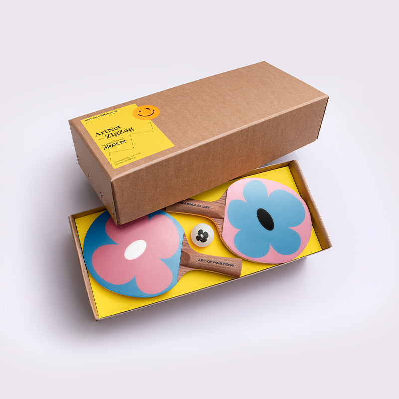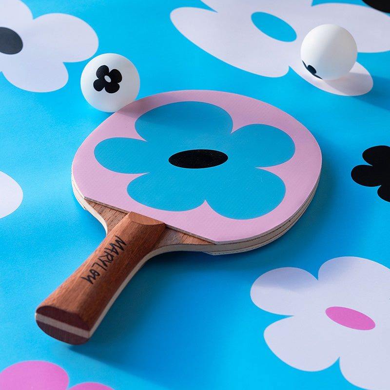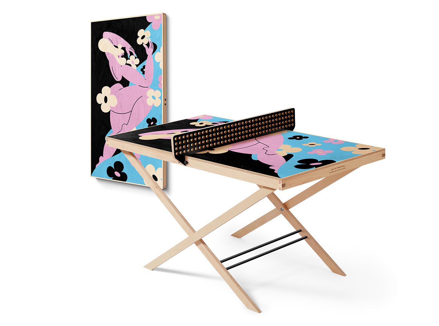 This hand-crafted, wall-mountable mini table tennis table features a strikingly bold and elegant artwork by French artist Marylou Faure.