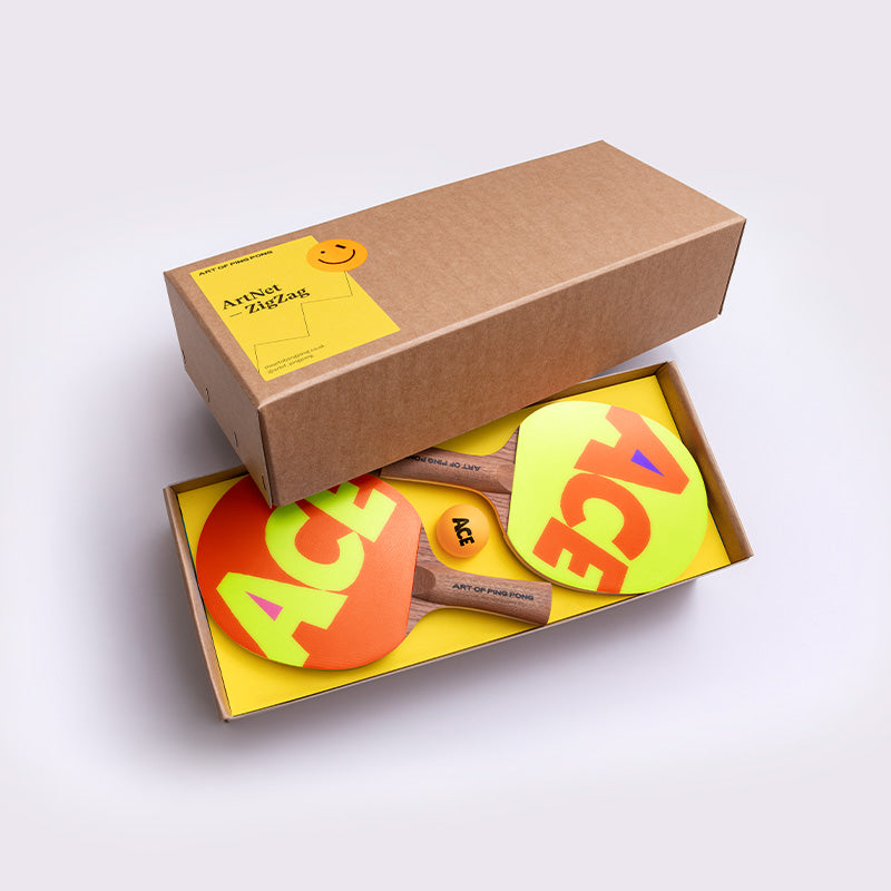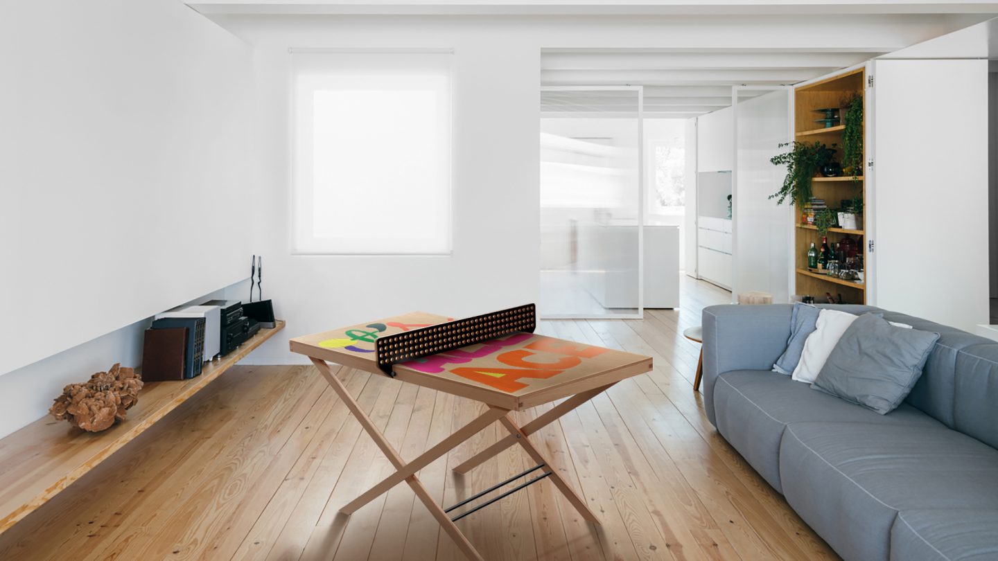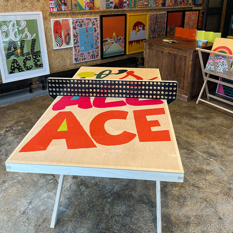 This hand-crafted and wall-mountable mini table tennis table features an exclusive design created in partnership with print studio Rude.
