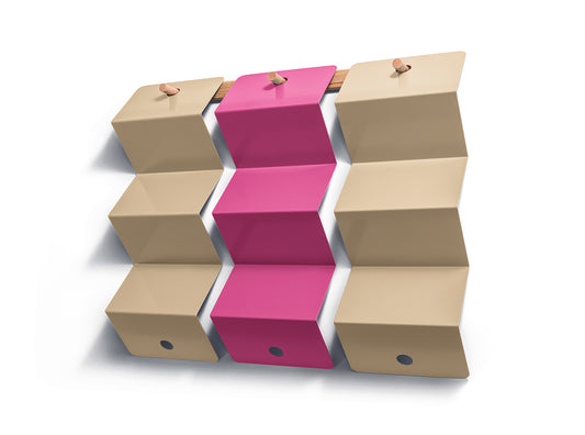 Each set includes three interlocking net pieces that transform any surface into a playable table in seconds. When not in use, they hang beautifully on their oak rack — transforming your wall into a statement of play.