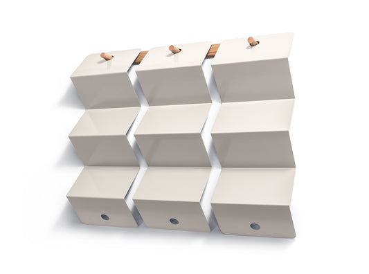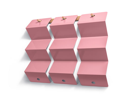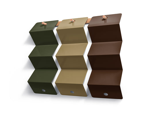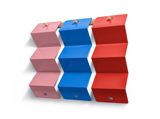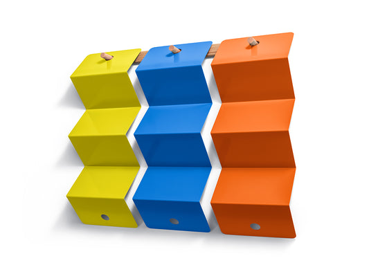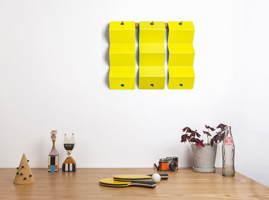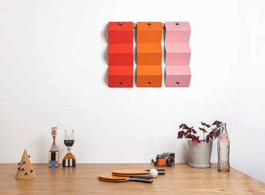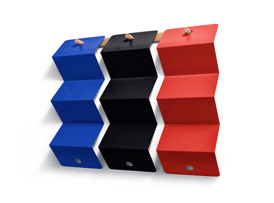 Each set includes three interlocking net pieces that transform any surface into a playable table in seconds. When not in use, they hang beautifully on their oak rack — transforming your wall into a statement of play.