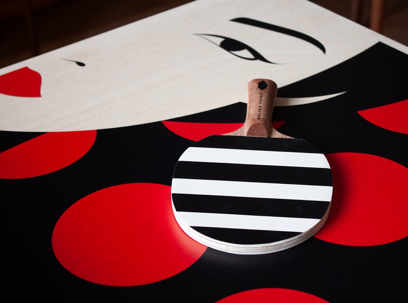 This handcrafted, wall-mountable mini table tennis table featuring artwork by French artist Malika Favre is a striking lesson in using positive/negative space and colour.Limited edition of 25, signed and numbered.